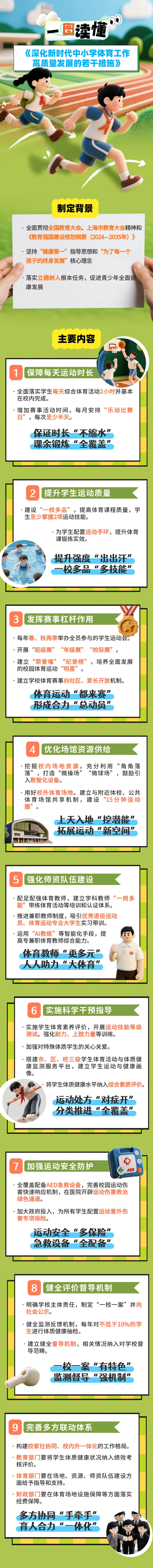 近日,上海市教卫工作党委、上海市教委印发《深化新时代中小学体育工作高质量发展的若干措施》(以下简称《若干措施》),聚焦当前中小学体育工作重点难点,从课程、赛事、场地、师资、保障等九个方面建立深化中小学体育工作高质量发展长效机制,全方位呵护青少年体质健康、全面发展。