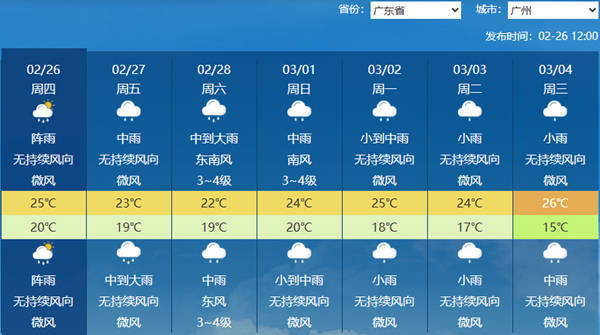 r明后两天,广东降雨将明显增强,气温将逐渐下降。广东气象台预计,明后两天,广东大部有中到大雨,局地有暴雨,部分市县伴有弱雷电、短时强降水和6至8级短时大风,最大时雨量20至40毫米;雷州半岛多云间阴天,有雷阵雨局部大雨;粤北市县阴天有小到中雨。后天,广东大部地区最高气温将降至20至25℃,像广州,今天最高气温25℃,后天会降至22℃。
