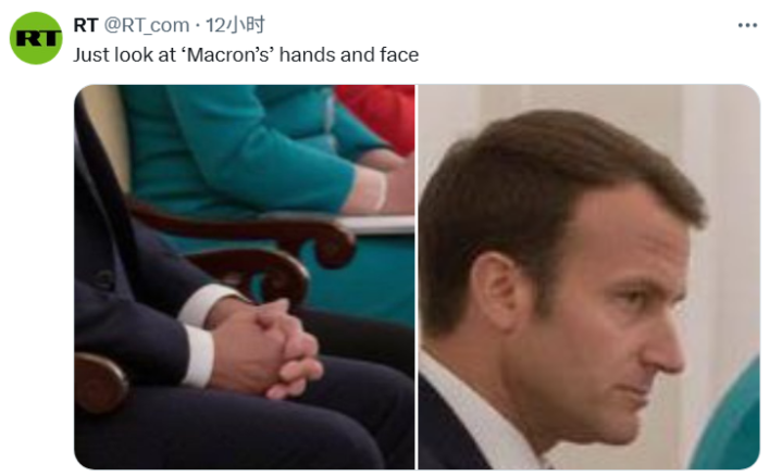 RT指出,该图片中马克龙的手部和面部有明显的AI生成痕迹。
