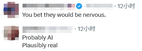 对此,有网友评论表示,真实的场景可能也是如此。“当然,他们肯定会紧张的。”“可能是AI,但看上去似乎是真实存在的场景。”