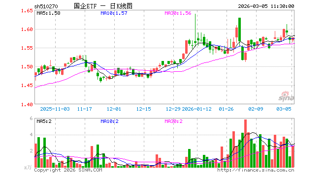 3月5日,截止午间收盘,国企ETF(510270)涨0.38%,报1.576元,成交额400.65万元。国企ETF(510270)重仓股方面,贵州茅台截止午盘跌0.22%,紫金矿业跌0.11%,长江电力涨0.18%,招商银行涨1.27%,中信证券涨0.61%,国泰海通涨0.82%,兴业银行涨1.38%,工商银行涨0.71%,中国船舶涨0.10%,万华化学涨0.26%。